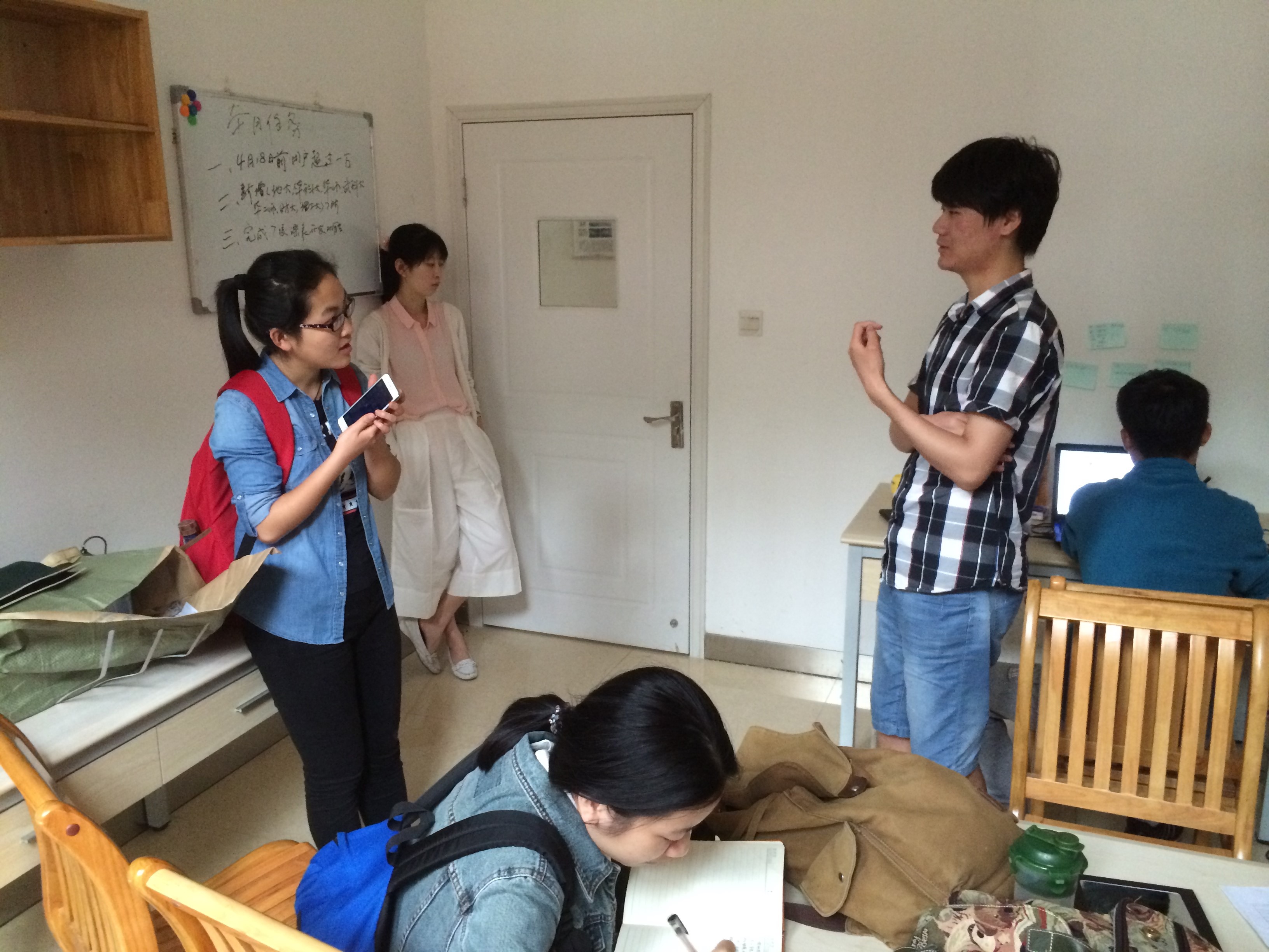参观完各类展板,大家步入实践中心内的各团队工作区,每个团队在各自的创业单间办公,在门口都贴有公司简介,让大家对公司的情况一目了然,我们支部也选取了其中一个名叫“小街科技团队”进行深入的了解与采访。我们采访了团队的负责人也是创始人之一的张俊杰同学,他是来自我们AV淘宝