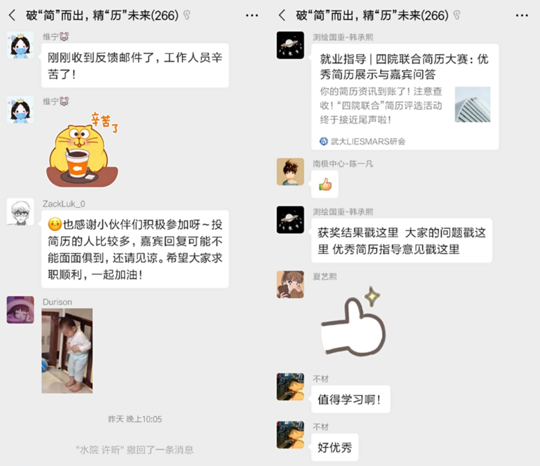 接下来,继续举办了破“简”而出,精“历”未来简历制作大赛。大赛面向全校研究学生征集优秀简历,并组织企业资深HR对参赛作品进行评议甄选,评选出优秀作品,予以表彰。评审嘉宾邀请到了字节跳动推荐策略产品经理刘千卉老师,中国电建集团华东勘测设计研究院人事与聘用综合主管(招聘经理)蒋建平老师、旭辉地产人力资源高级主管贾冰阳老师以及腾讯华中区域校招HR Stella老师。经过一周的简历收集和嘉宾评选,从提交的50多份简历中,评选出了9份优秀简历,予以奖励并在公众平台进行展示。此外,嘉宾还对每一份提交的简历均予以评价并提出相应的建议。另外,在简历评选过程中,嘉宾们还就同学们关心的问题给予了解答。嘉宾们认为:(1)具有相关的实习、项目经历更能够在求职过程中脱颖而出;(2)求职者需要在求职过程中体现出自己的思考和抽象能力十分重要,同时,良好的沟通能力也是必不可少的;(3)面试者需要熟悉自己简历上的内容,可以提前多进行一下面试的训练,了解面试的套路。