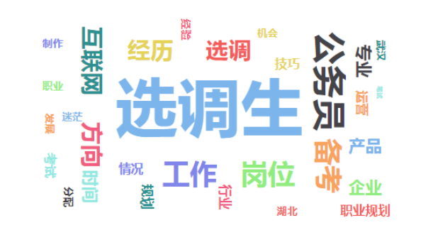 本次活动分为两期举行,共计83位同学报名。从活动的报名意愿来看,选调生嘉宾对同学们吸引力最强。此外,互联网公司华为、阿里巴巴,证券类公司天风证券、国盛证券,地产名企葛洲坝也具有较强的吸引力;从报名者的职业发展困惑来看,大部分学生对选调生和公务员备考、岗位与专业匹配度比较迷茫。