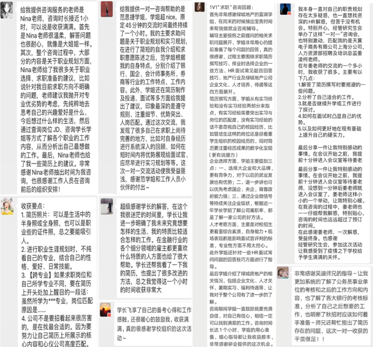 党委研究生工作部、经管学院研究生会以及“研途有我”发展解忧专项小组联合筹办了为期一个月的“研途有我”发展解忧计划之一对一云端“职”询活动,使毕业生以及在校生们在家也能更有效地进行职业规划。本次活动非常荣幸地邀请到了互联网、地产、金融、快消等行业的招聘经理以及机关事业单位的选调生作为活动嘉宾,采取腾讯会议一对一交流形式为同学们答疑解惑。