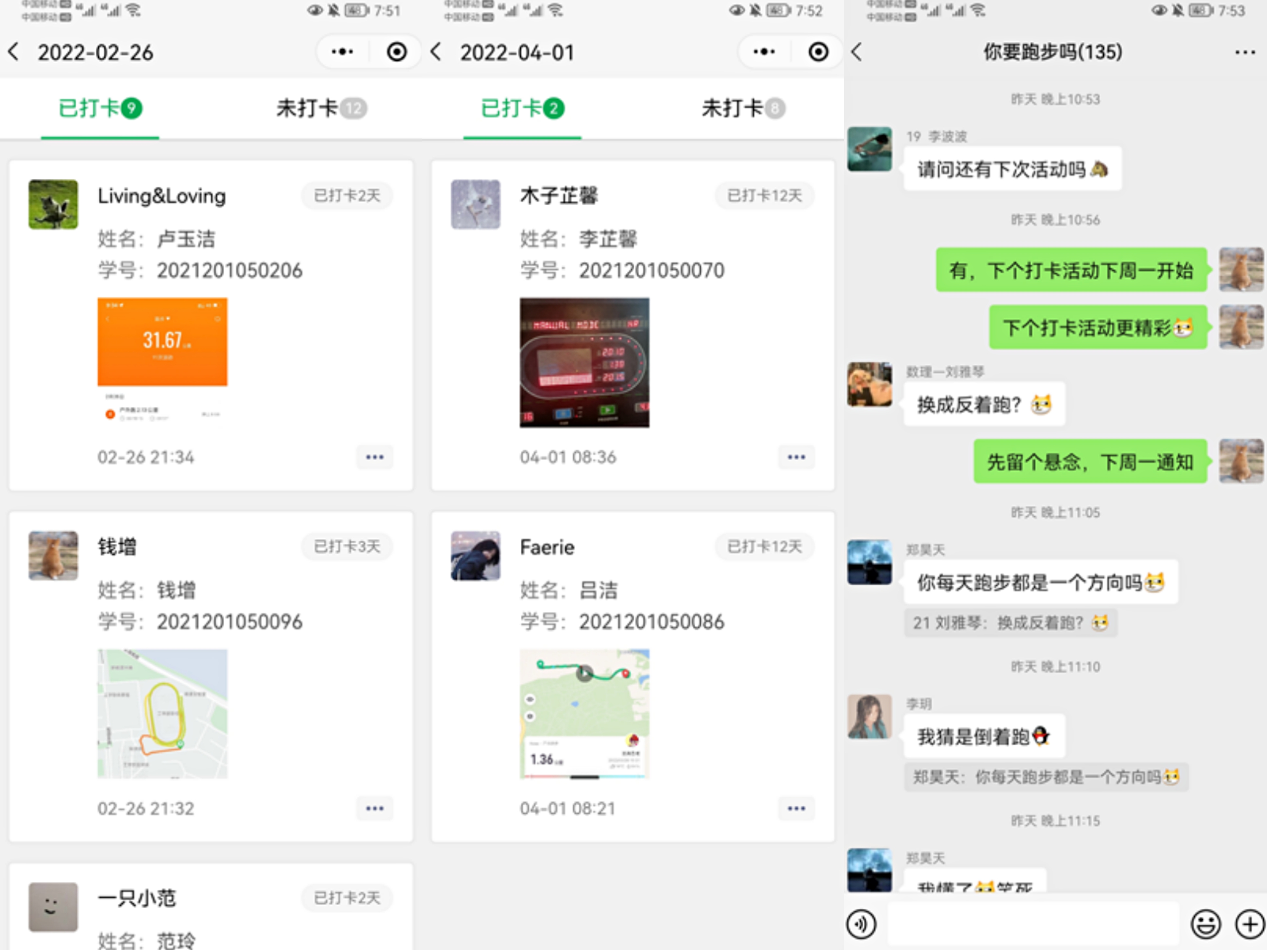 跑步打卡活动于2022年2月25日—4月10日举行,社群内牵头人组织跑步打卡活动,每次打卡活动累计30天,考虑到天气、学习科研压力等因素,打卡满12次即可领取奖品。