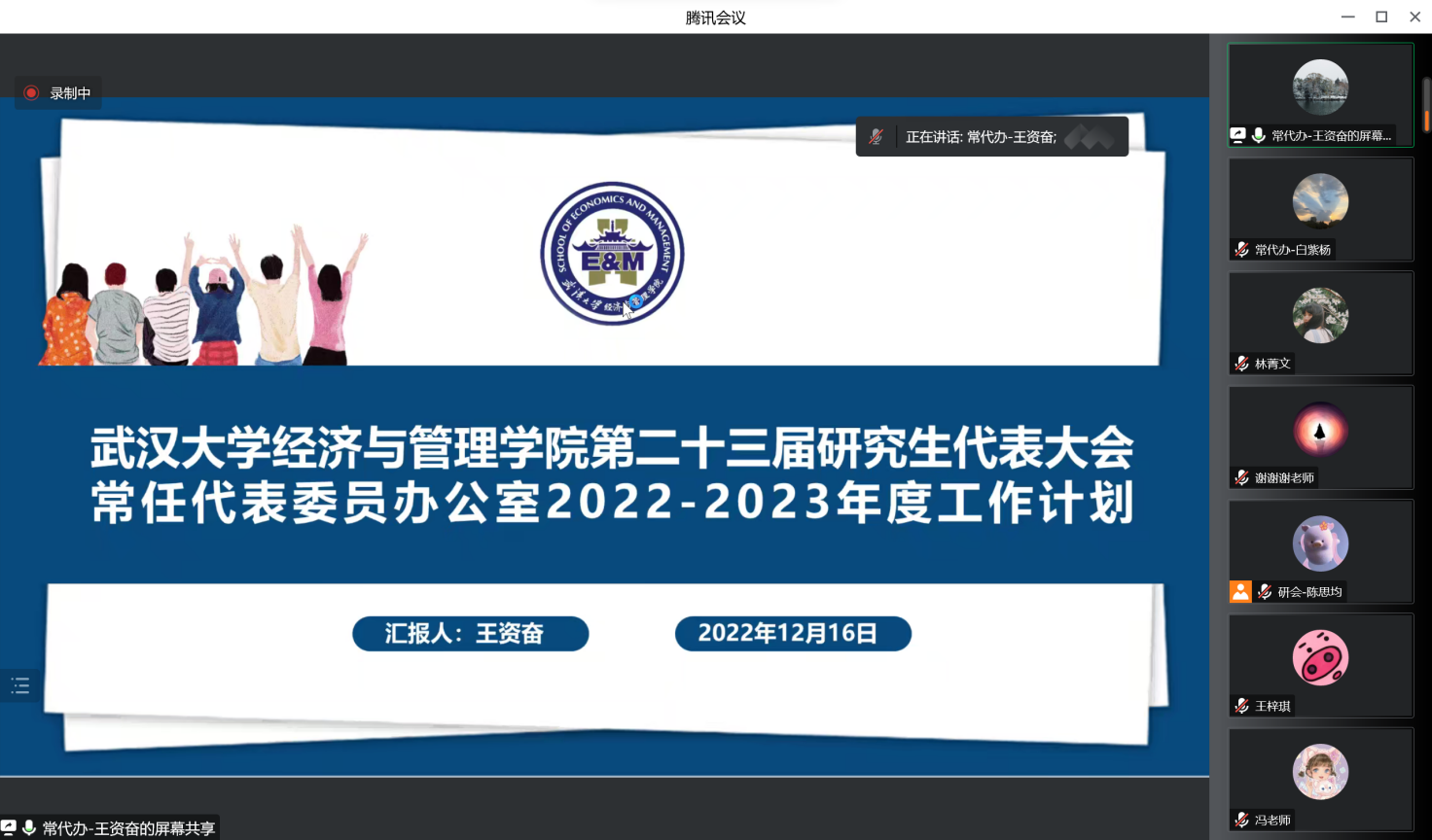 第二十三届研究生代表大会常任代表委员会办公室2022-2023年度工作规划。王资奋同学介绍了常代办的主要工作职能、过去一学期的工作回顾和下一学期的工作规划,提出常代办的工作重点会放在筹备常代会等会务工作、对接代表、班长和其他工作部门以及试行提案制等方面。
