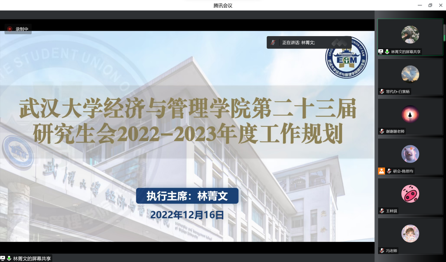 第二十三届研究生会2022-2023年度工作规划。林菁文同学提出新一届研究生会对整体工作方向的计划与部署可归纳为以下五点:脚踏实地,落实基本任务;革新自我,抓好团队建设;服务同学,聚焦实际需求;联动院校,树立经管形象;团结同志,建功伟大时代。