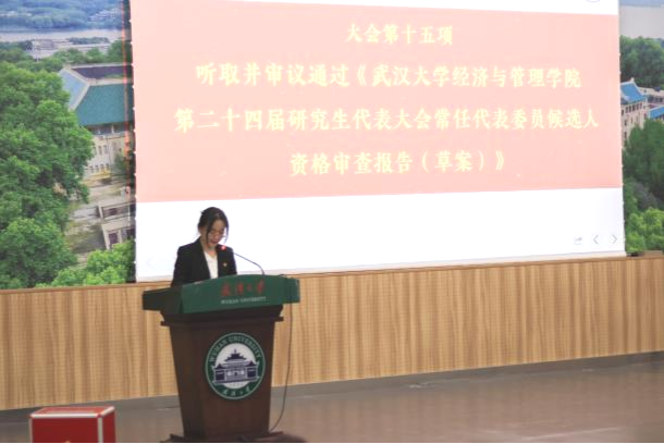 第二十一次研究生代表大会代表候选人资格审查报告。大会总监票人张一琪同学主持选举计票环节,四名研究生会主席团候选人分别上台竞选演讲并就研究生会工作的有关问题进行现场作答。