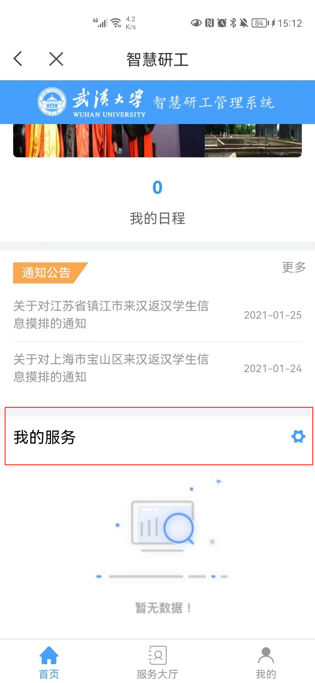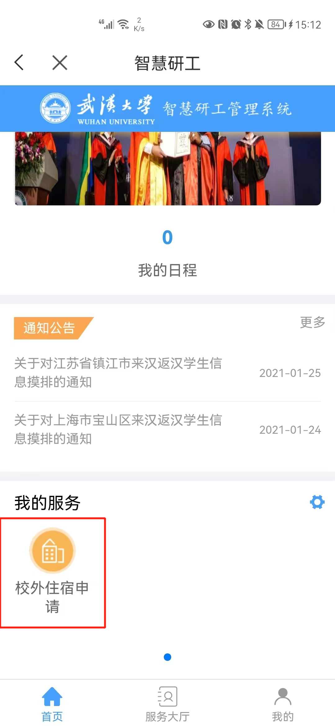 2.登录“智慧珞珈App-智慧研工-我的服务(右上角设置-定制常用服务)”,选择“校外住宿申请”,点击“在线办理”。填写好所有项目后点击“提交申请”(注意,其中上传附件处需上传附件1的扫描件)。