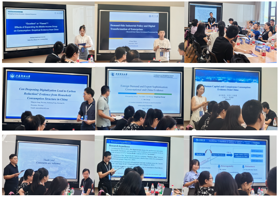 The process of this academic symposium was divided into two sessions in the morning and afternoon, with a total of ten young scholars sharing their research findings. They were Wang Junmeng, a master's student from Zhejiang Gongshang University, Chen Siyu, a doctoral student from Northwest University, Li Jinpu, a doctoral student from Tsinghua University, Sun Wei, a master's student from Shandong Normal University, Associate Professor Zhong Tenglong from Central University of Finance and Economics, Guo Xiaonan, a doctoral student from Zhejiang University, Wei Jishi, a doctoral student from Wuhan University, Chen Mingcong, a doctoral student from Xiamen University, Cheng Hong, an undergraduate student from Beijing University of Posts and Telecommunications, and Liu Yaqi, a doctoral student from Shanxi University of Finance and Economics. These ten young scholars embarked from multiple dimensions such as macroeconomic policies, household consumption upgrading, application of digital technologies, infrastructure construction, and supply chain management, analyzed the interaction between the digital economy and demand-side reform, and shared the latest research results.
