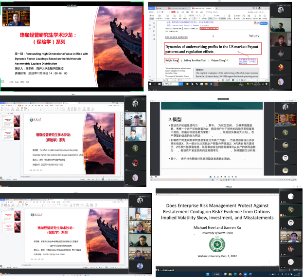 2022年11月19日至12月7日,保险与精算系成功举办了珞珈经管研究生(保险学)系列学术沙龙,此次学术沙龙共分为六期举行,保险与精算系先后邀请了六名在保险学与企业风险管理领域的专家学者为保险与精算系研究生和部分本科生进行专题讲座活动。此系列学术沙龙活动分别由王正文老师、潘国臣老师、杨霞老师主持,系所老师积极参与,沙龙中系所师生与受邀专家就相关保险学研究主题展开了热烈的讨论。