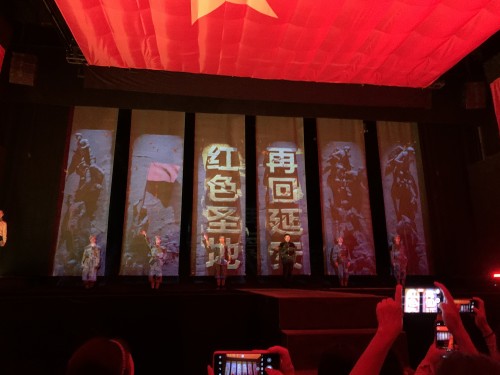 在情景式教学中,老师们沉浸式体验了《再回延安》舞台剧。《再回延安》以一位老红军的日记为线索,从一名普通士兵的视角出发,通过“一座感人的博物馆”“一粒希望的种子”“一条风雪长征路”和“一面不朽的旗帜”四个部分回溯了长征路上某红旗班翻越雪山、跨过沼泽,不惧艰难险阻,用生命守护红旗到延安的故事。