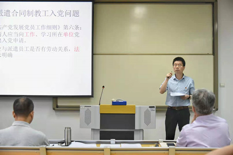 组织员孙建超围绕党员发展中的有关问题和与会者进行了交流。他从发展党员的流程出发,探讨了支部应如何引导群众积极靠拢党组织进而扩大入党申请人队伍,分析了派遣制合同教工的入党及其组织关系等问题。