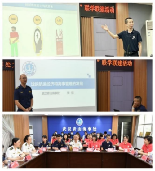 武汉海事局政委、党委副书记兼纪委书记石钦,武汉海事局党群工作部副主任王田,武汉海事局人事教育处副处长王钦霈,武汉青山海事处党支部支委班子及党员代表热情欢迎师生到来。师生一行通过参观青山海事处文化长廊党建宣传阵地,对海事智能管理以及海事处“建长江一流强处”的业务特色形成了深刻印象。