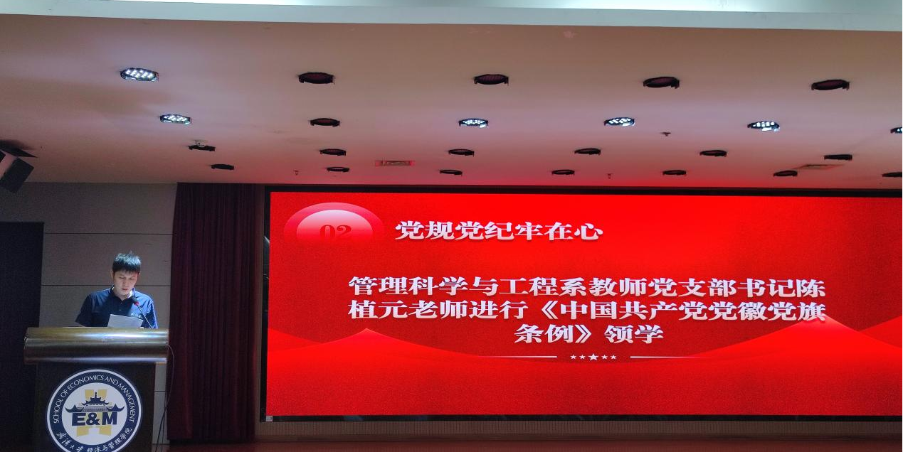 许明辉教授、戴宾教授、陈植元副教授、柯剑男副教授、易殊玥老师、研工办主任沈仕雄老师、管理科学与工程硕士党支部、博士支部全体党员同志及硕士团支部、博士团支部同学参加本次党日活动。由管理科学与工程硕士党支部书记汪雨欣同志主持。