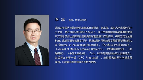 金融研究中心主任,特许金融分析师(CFA)持证人,兼任中国金融学年会理事和中国中文信息学会社会媒体处理专委会智能金融工作组长等。研究方向为金融科技、投资管理和机器学习等,具备金融+科技的跨学科背景与研究能力,在《Journal of Accounting Research》《Artificial Intelligence》《Journal of Machine Learning Research》《管理科学学报》《金融研究》《中国工业经济》等期刊和会议上发表多篇论文;出版英文专著一部(CRC Press出版)。主持国家自然科学基金等项目,已结题自科青年项目评估为特优。下面有请李斌教授。