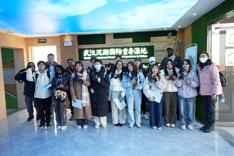 沉湖科普展览馆内,中外学子们被形态各异的鸟蛋标本和生动的鸟类栖息习性介绍深深吸引。随着科普纪录片的播放,湿地从生态修复到物种繁衍的全过程跃然眼前,作为“国际湿地城市”中唯一一个人口超千万的生态发展案例,武汉生态建设成果让同学们为之震撼。这一刻,理论知识与现实场景无缝对接,沉浸式学习为后续的实地观鸟实践筑牢了根基。