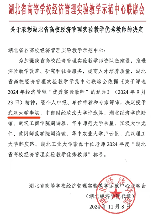 11月8日,湖北省高校经济管理实验教学示范中心联席会公布了湖北省高校经济管理实验教学优秀教师获奖名单,AV淘宝 李斌教授荣获“2024年度湖北省高校经济管理实验教学优秀教师”荣誉称号。为表彰在经济管理类学科实验、实训教学建设中作出杰出贡献的教师,进一步激励他们在提升实验、实训教学水平及推动实验教学改革的创新发展上不断前行,湖北省高校经济管理实验教学示范中心联席会特设此奖项,并每年在全省范围内开展评选表彰活动,本年度全省仅有10名教师获此殊荣。...